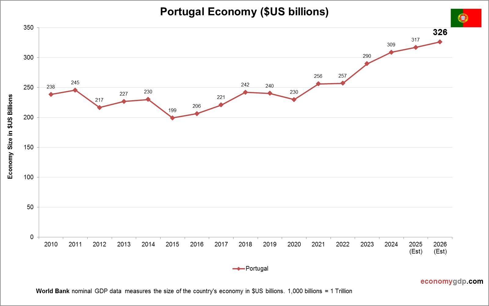 Portugal’s economy, at $250 billion, is mid-sized within the EU, with services and industry driving its GDP, supported by tourism. See Portugal GDP.