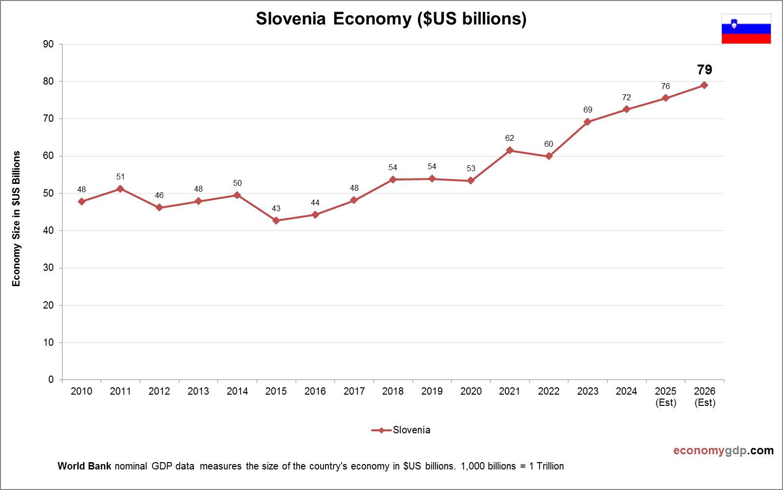 Slovenia’s economy, at $60 billion, is small within the EU, with industry and services driving its GDP, supported by exports. See Slovenia GDP.