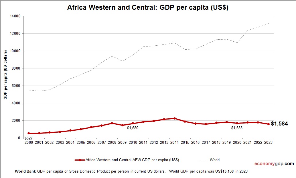 This diagram presents Africa Western and Central GDP per capita. This is according to World Bank GDP stats by country. Based on the latest available information for Africa Western and Central.