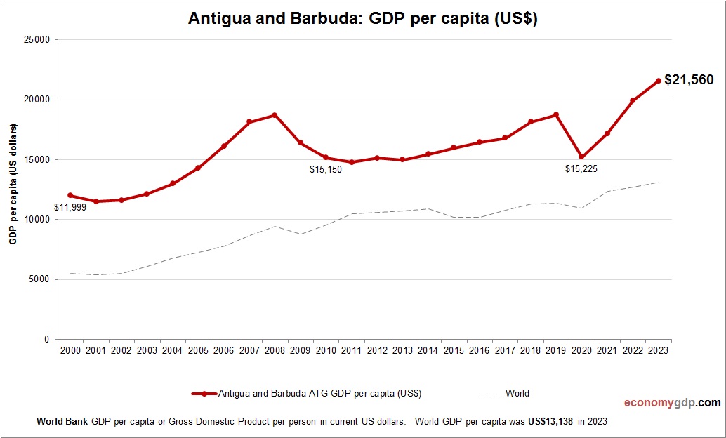 This chart demonstrates Antigua and Barbuda GDP per capita. The economic data is provided by World Bank. Latest GDP per person information for Antigua and Barbuda.