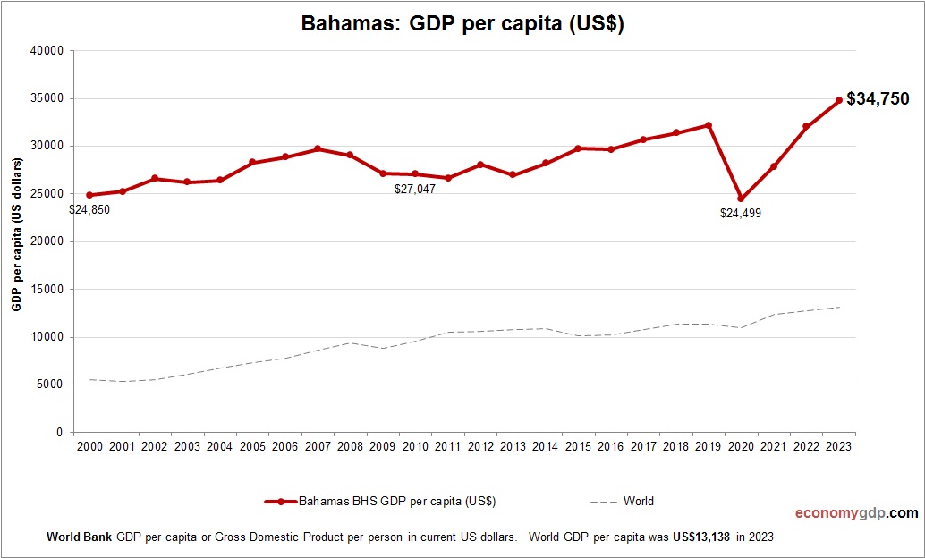 This chart demonstrates Bahamas GDP per capita. The gross domestic product statistics are compiled by World Bank. Based on the latest economic info provided for Bahamas.
