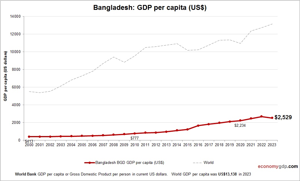 Bangladesh’s GDP per capita reached $2,529 in 2023, reflecting a 5.91% decline from the previous year. Despite this dip, the country has experienced significant growth over the past two decades, with GDP per capita increasing from $974 in 2013 to over $2,500 in 2023. This growth is attributed to robust sectors such as textiles, agriculture, and remittances. However, challenges like inflation and external economic pressures have impacted recent performance.
