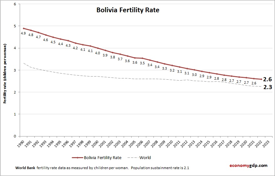 Chart above demonstrates Bolivia Fertility Rate. World Bank is the source of this birth data. Latest births per woman information for Bolivia.