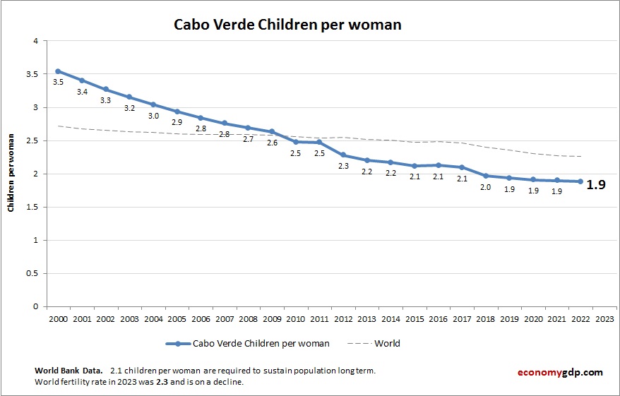 Chart above demonstrates Cabo Verde Children Per woman. This is according to World Bank birth stats by country. Based on the latest available information for Cabo Verde.