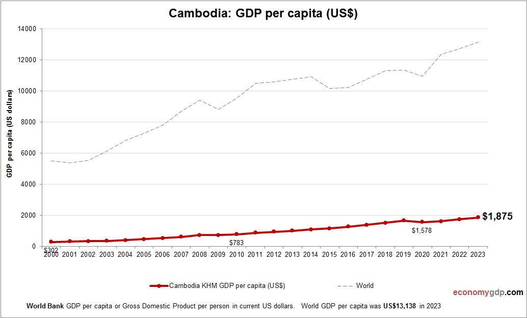 Cambodia’s GDP per capita has been growing, supported by garment manufacturing, agriculture, and tourism. The country faces challenges such as labor rights concerns, income inequality, and dependency on specific export markets.