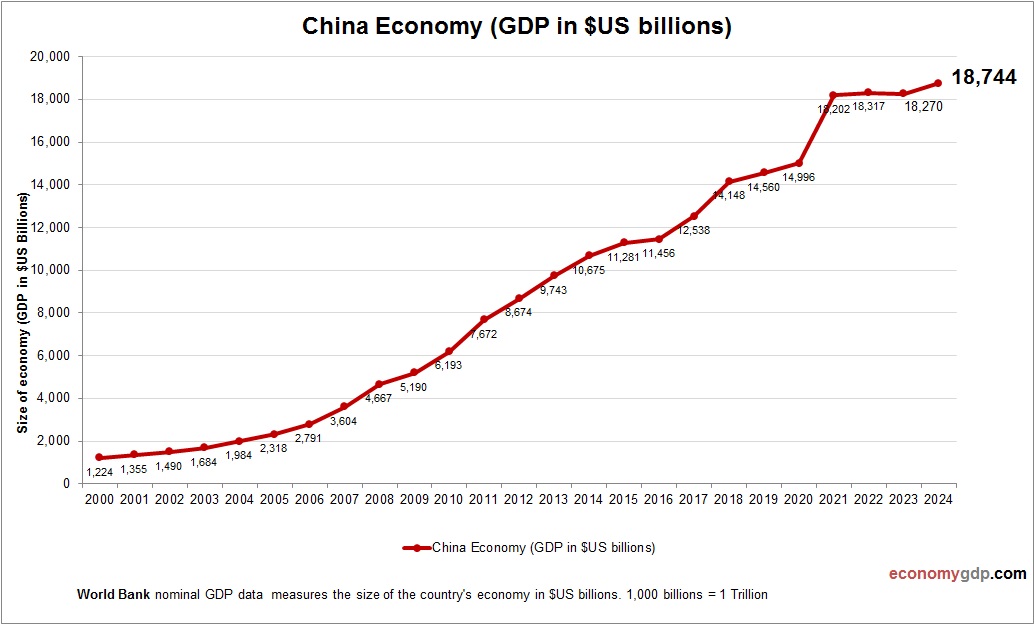 China’s economy, the second largest globally, has a nominal GDP of around $18 trillion. Manufacturing, technology, and exports drive its scale, contributing significantly to global trade. Rapid urbanization and infrastructure investments bolster growth, though debt and geopolitical tensions pose risks. As a key player in electronics and AI, China’s economic influence spans Asia and beyond, with its Belt and Road Initiative expanding trade networks, making it a central force in the global economy. See China GDP.