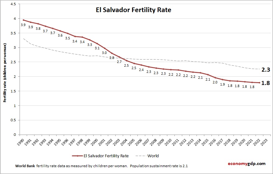 Chart above demonstrates El Salvador Fertility Rate. This is according to World Bank birth stats by country. Latest births per woman information for El Salvador.