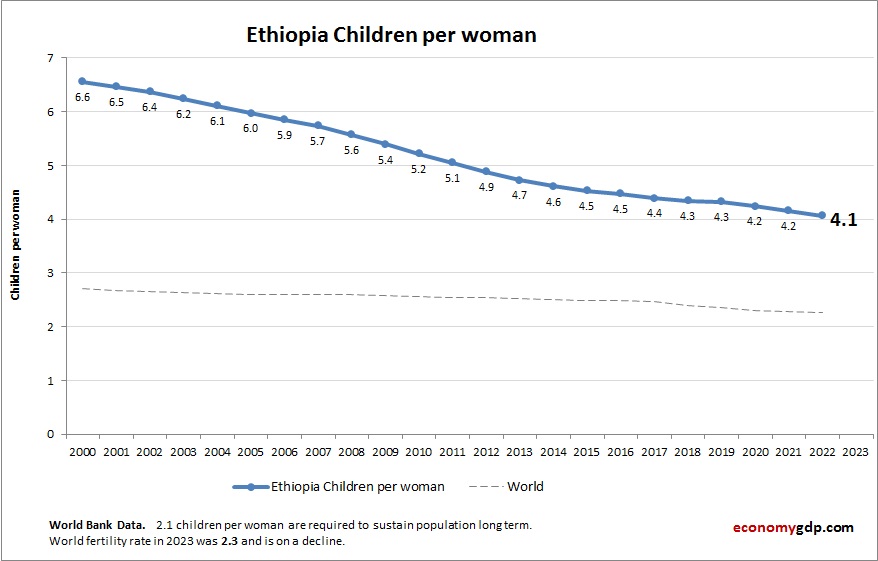The above graph shows Ethiopia Children Per woman. This is according to World Bank birth stats by country. Latest births per woman information for Ethiopia.