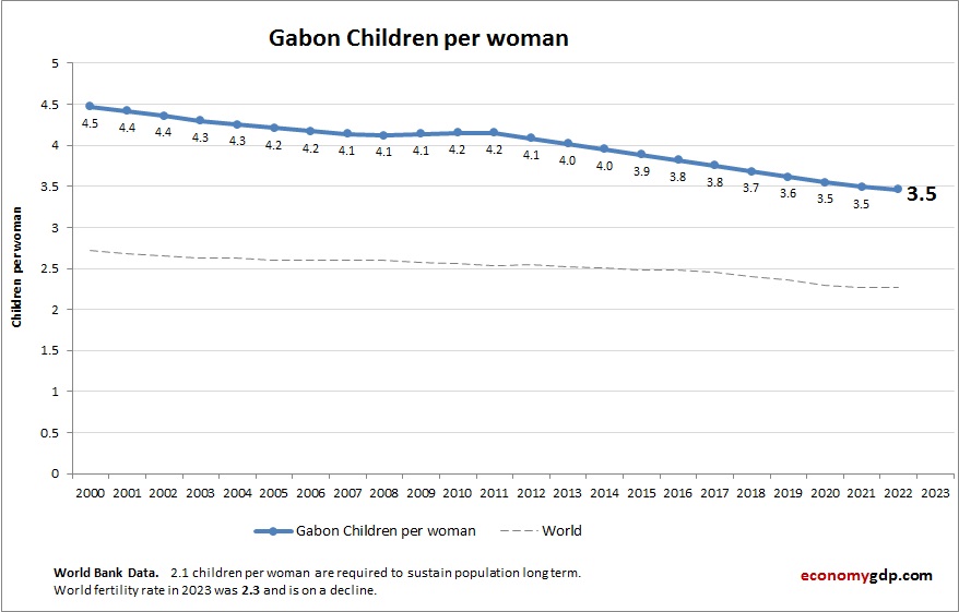 This diagram presents Gabon Children Per woman. World Bank is the source of this birth data. Latest births per woman information for Gabon.