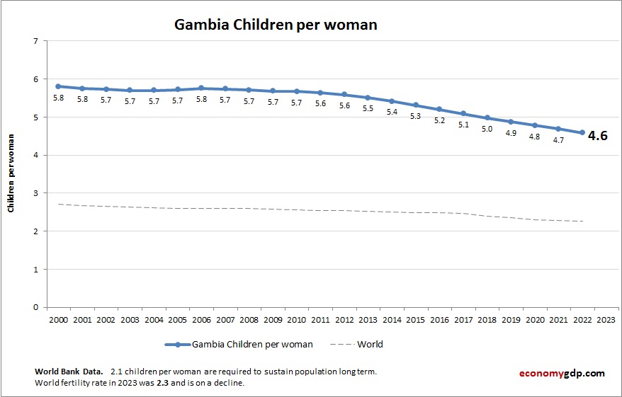 Gambia has a high children per woman rate. Rural traditions, low contraceptive use, and limited healthcare access contribute to large families.