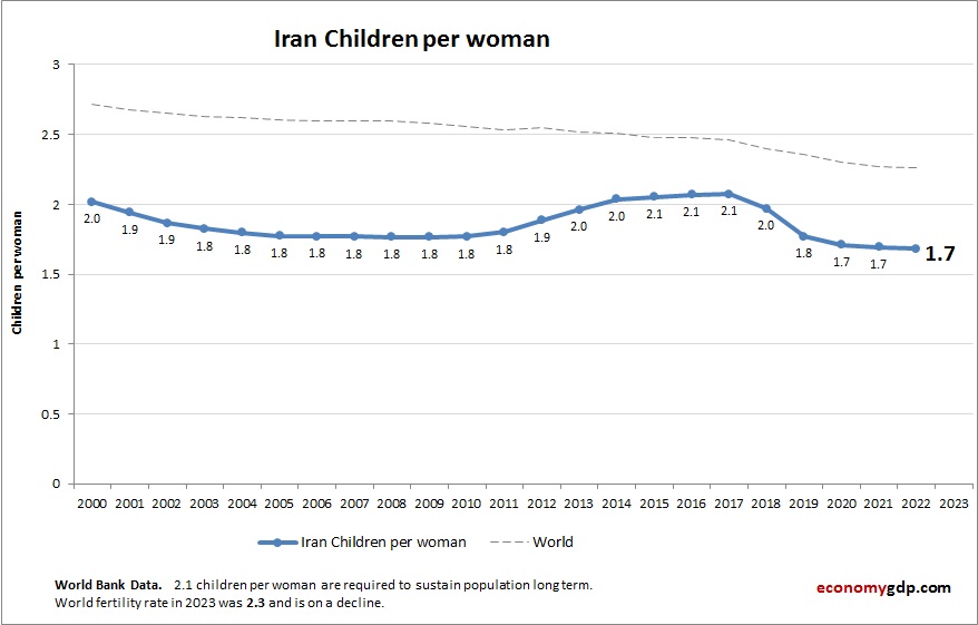 Chart above demonstrates Iran Children Per woman. World Bank is the source of this birth data. Based on the latest demographics info provided for Iran.