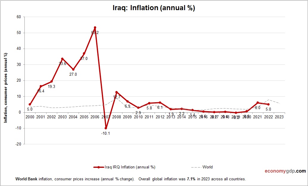 This chart demonstrates Iraq Inflation. Inflation data is sourced from World Bank. Based on the latest available information for Iraq.
