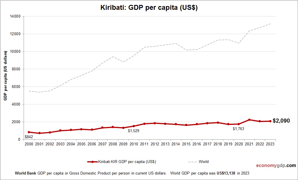 Kiribati’s GDP per capita in 2024 is projected to be around $2,455. As a small island nation, its economy relies on fishing and agriculture; climate change poses significant risks to its economic sustainability.
