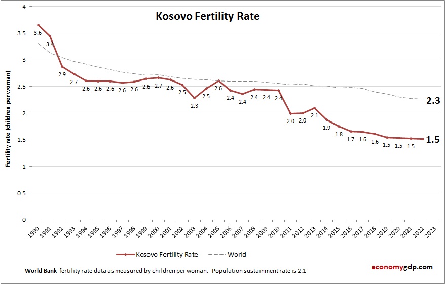 Kosovos fertility rate is moderate but declining as the country urbanizes and modernizes. Economic migration and rising education levels among women are leading to smaller family sizes.