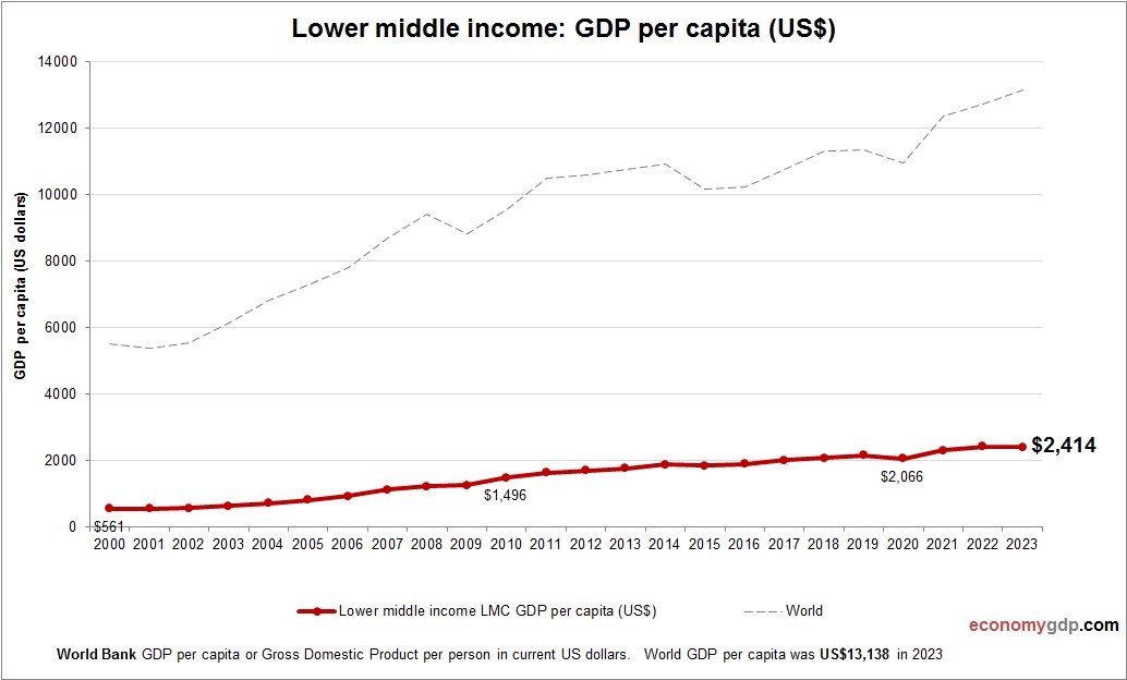 This chart demonstrates Lower middle income GDP per capita. The economic data is provided by World Bank. Based on the latest economic info provided for Lower middle income.