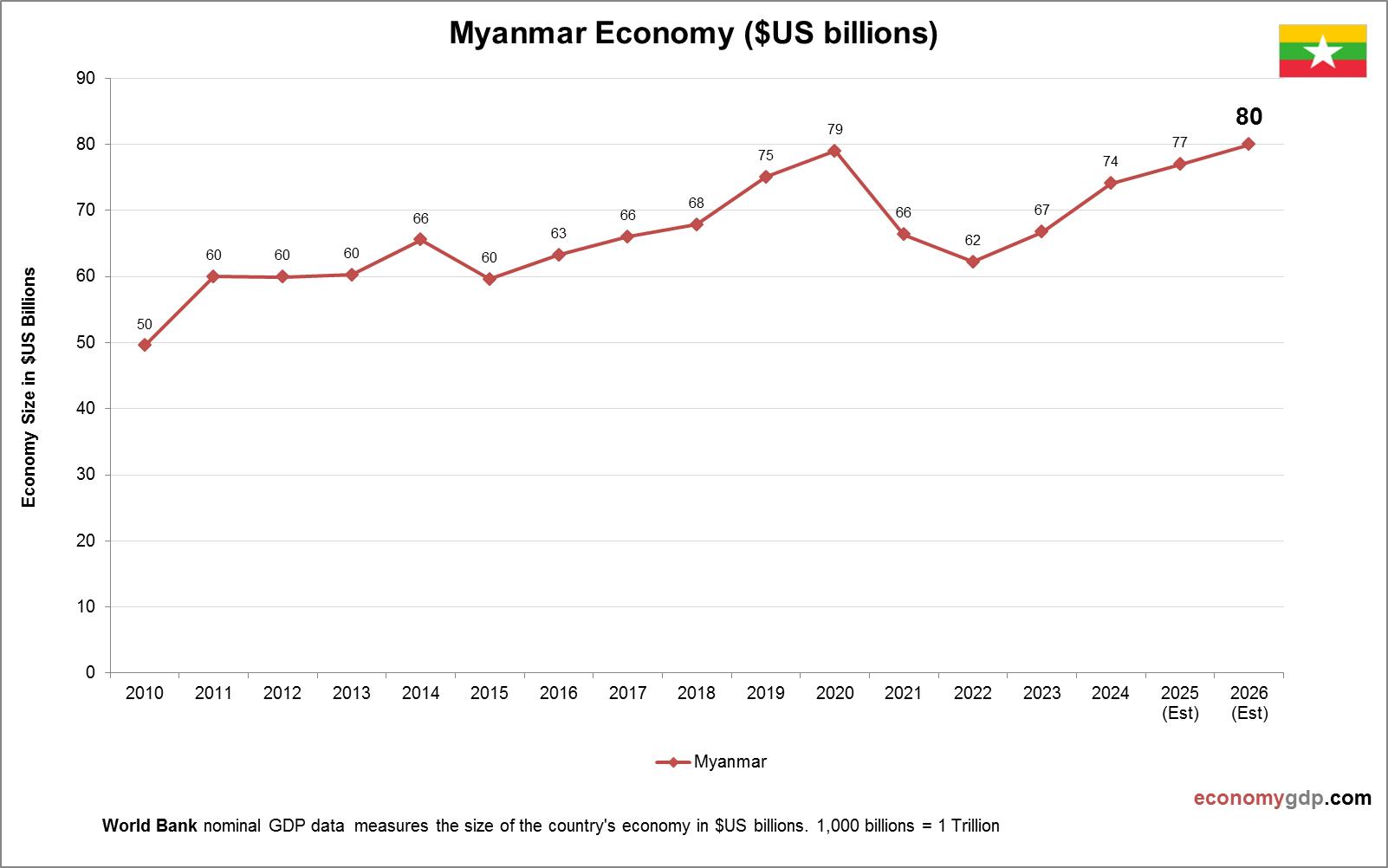 Myanmar’s economy, worth $65 billion, is mid-sized but disrupted, with agriculture and gas driving its GDP, limited by political instability. See Myanmar GDP.