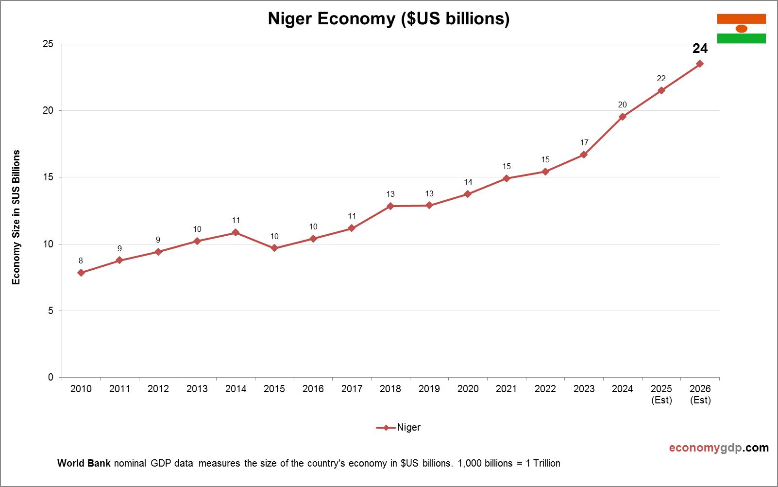 Niger’s economy, worth $15 billion, is small and fragile, with agriculture and uranium driving its GDP, limited by poverty and insecurity. See Niger GDP.