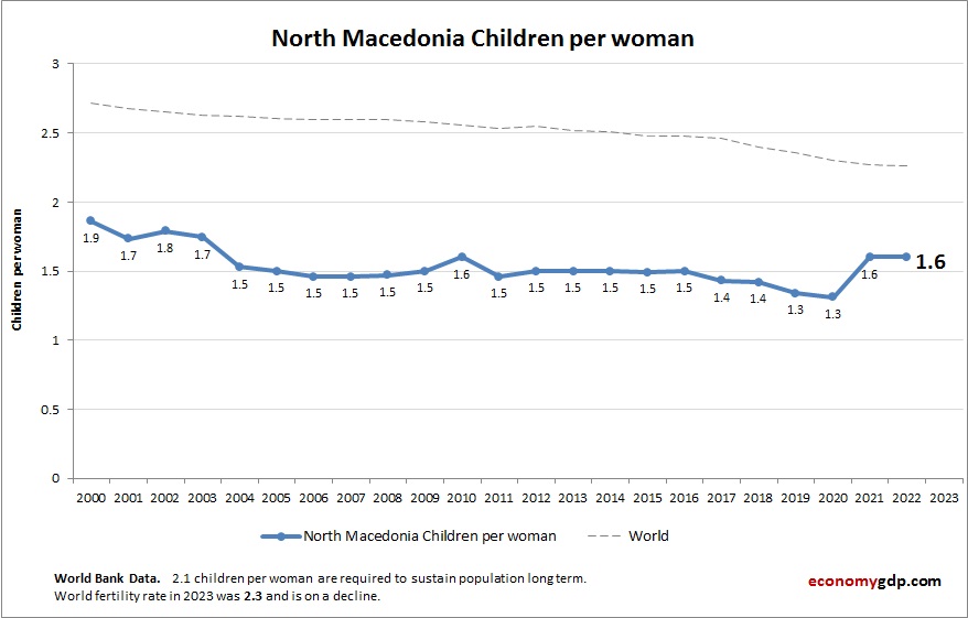 North Macedonias children per woman rate is low. An aging population, economic concerns, and delayed childbearing continue to drive demographic decline.
