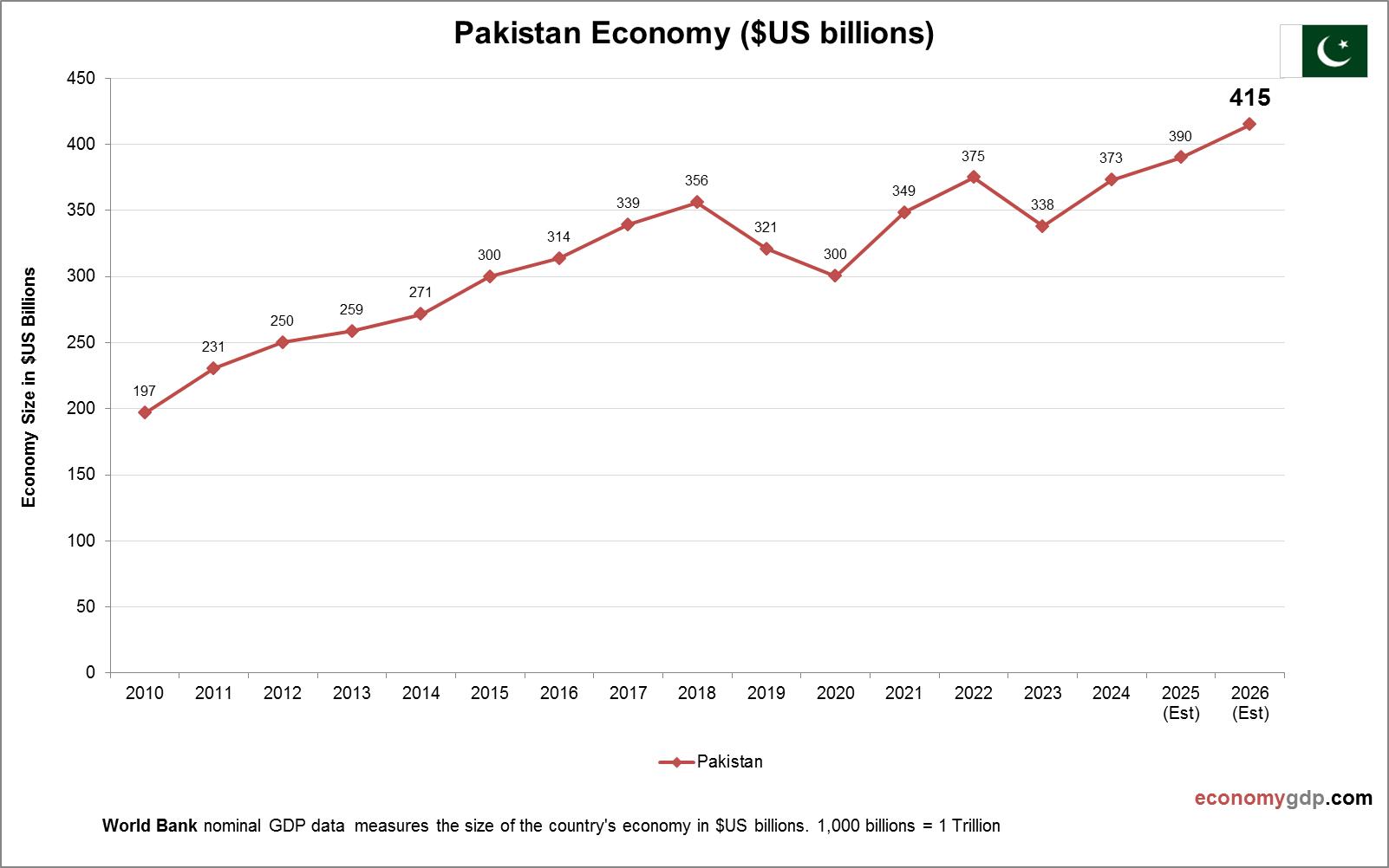 Pakistan GDP from 2010 to today. World Bank and OECD data. GDP in US dollars. Pakistan's $375 billion economy, growing 3.0% in 2025, relies on textiles, agriculture, and remittances, with per capita GDP at $1,500. Cotton exports dominate, while oil View diagram Pakistan GDP→