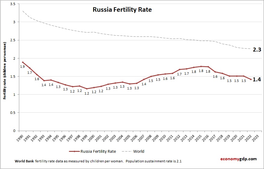 This diagram presents Russia Fertility Rate. The fertility rate statistics are compiled by World Bank. Latest births per woman information for Russia. Russias fertility rate is low and declining. Government policies encouraging larger families have had limited success in reversing View diagram Russia Fertility Rate