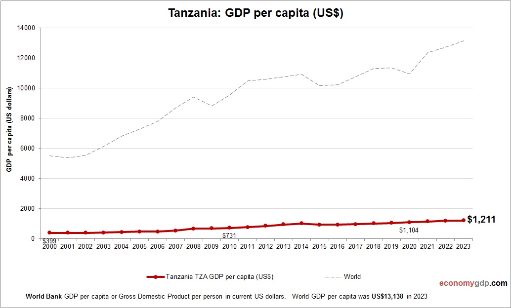 This diagram presents Tanzania GDP per capita. The economic data is provided by World Bank. Based on the latest available information for Tanzania.