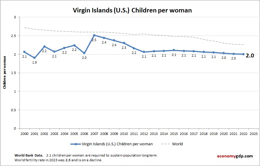 This diagram presents Virgin Islands (U.S.) Children Per woman. This is according to World Bank birth stats by country. Based on the latest available information for Virgin Islands (U.S.).