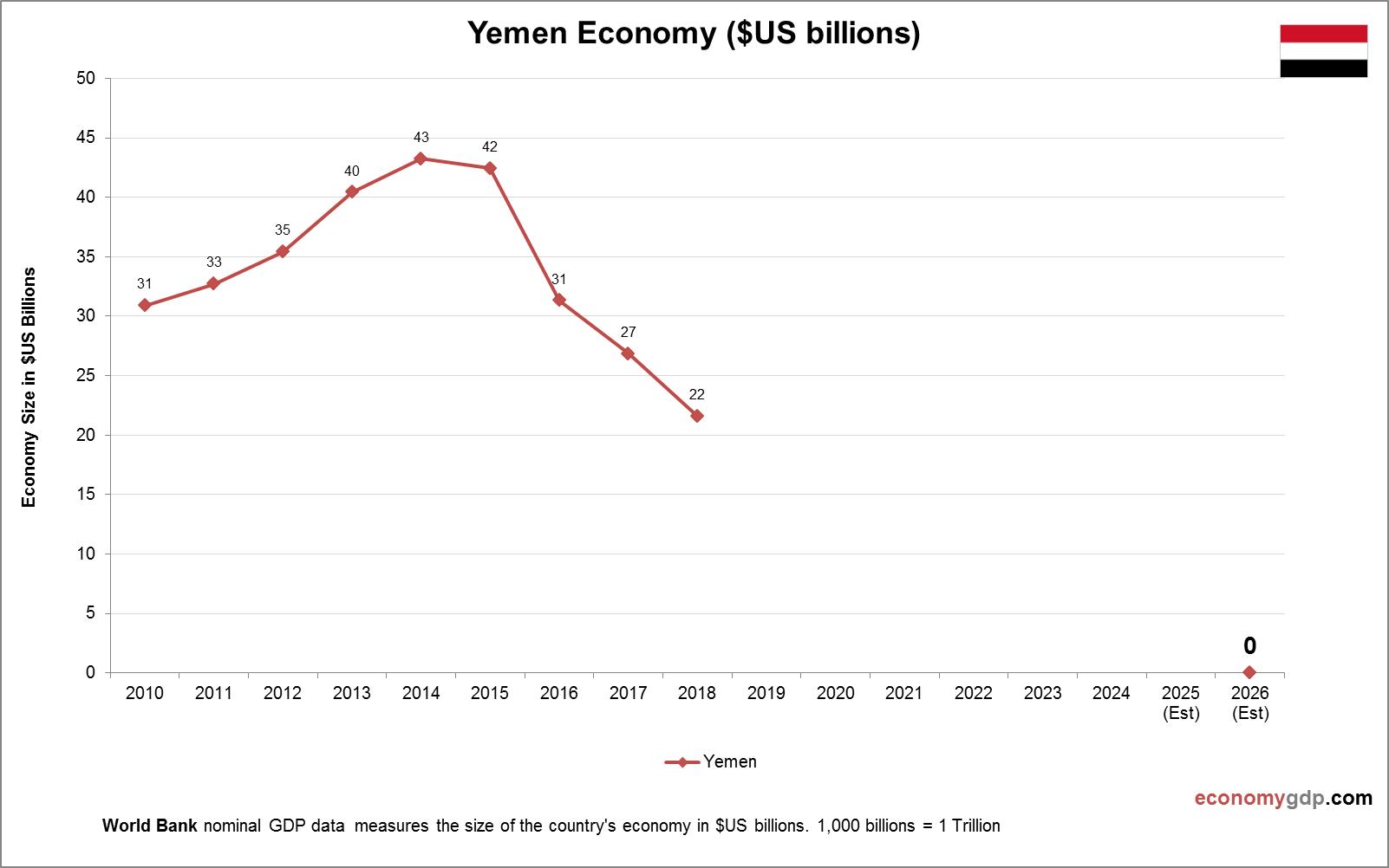 Yemen’s economy, worth $20 billion, is small and devastated, with agriculture and oil driving its GDP, limited by conflict. See Yemen GDP.